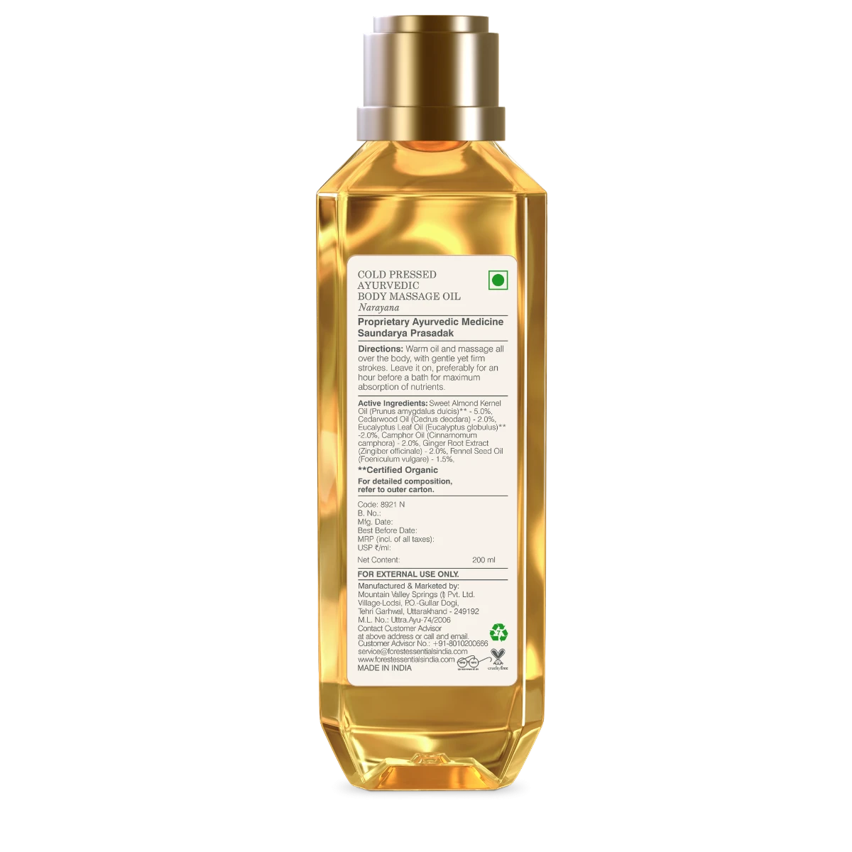 The Forest Essentials Ayurvedic Body Massage Oil Narayana is an anti-inflammatory massage oil which not only helps in relieving pain, but also brings instant relief from backaches, muscular strains and rheumatic pain. It also strengthens the bone tissues, and tones and firms the muscles.