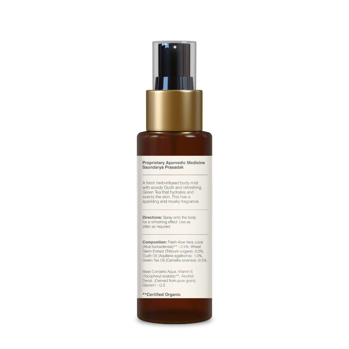 A fresh flower infused Body Mist with aromatic Oudh & Green Tea to soften, hydrate and scent the skin. This Forest Essentials Body Mist Oudh & Green Tea has a refreshing and sensuous aroma with musky