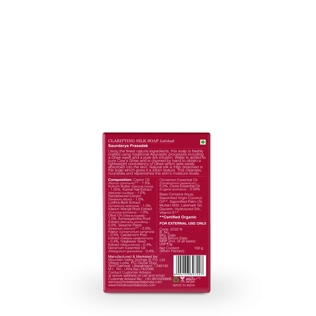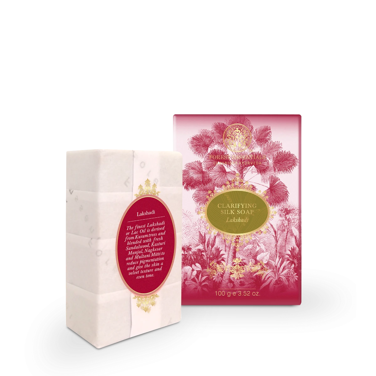 Lakshadi Tailam has been used for centuries in Ayurveda for its wonderful clarifying properties. The Forest Essentials Clarifying Silk Soap Lakshadi is curated with the finest Lac derived from Kusum trees along with the Sandalwood paste which is infused in Sesame Oil that balances oil production and helps to minimise open pores. This emollient soap also contains the healing properties of Kasturi Manjal that clarify, refresh and protect the skin. It is mixed with butter, herbs, oils and fresh pastes, infused with silk to create this exquisite soap.