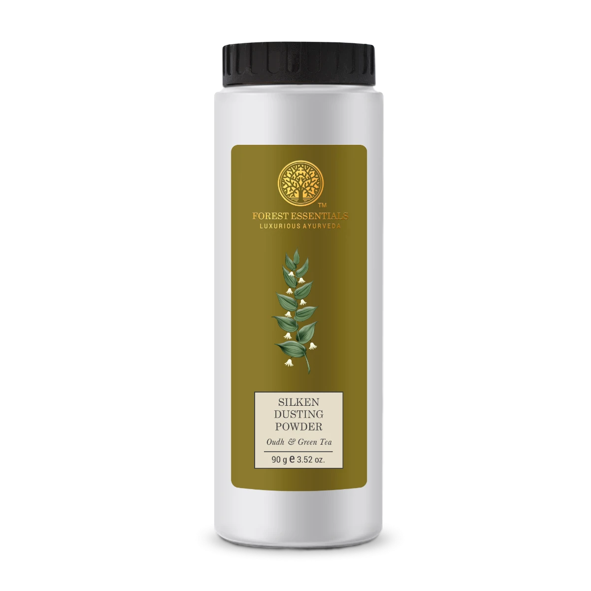 The Forest Essentials Silken Dusting Powder Oudh & Green Tea is a corn starch based powder, which is 100% natural, highly absorbent and leaves the skin smooth and refreshed. Fresh Green Tea infusion from the Darjeeling hills is blended with smoky Oudh wood for an unmistakable and addictive fragrance.