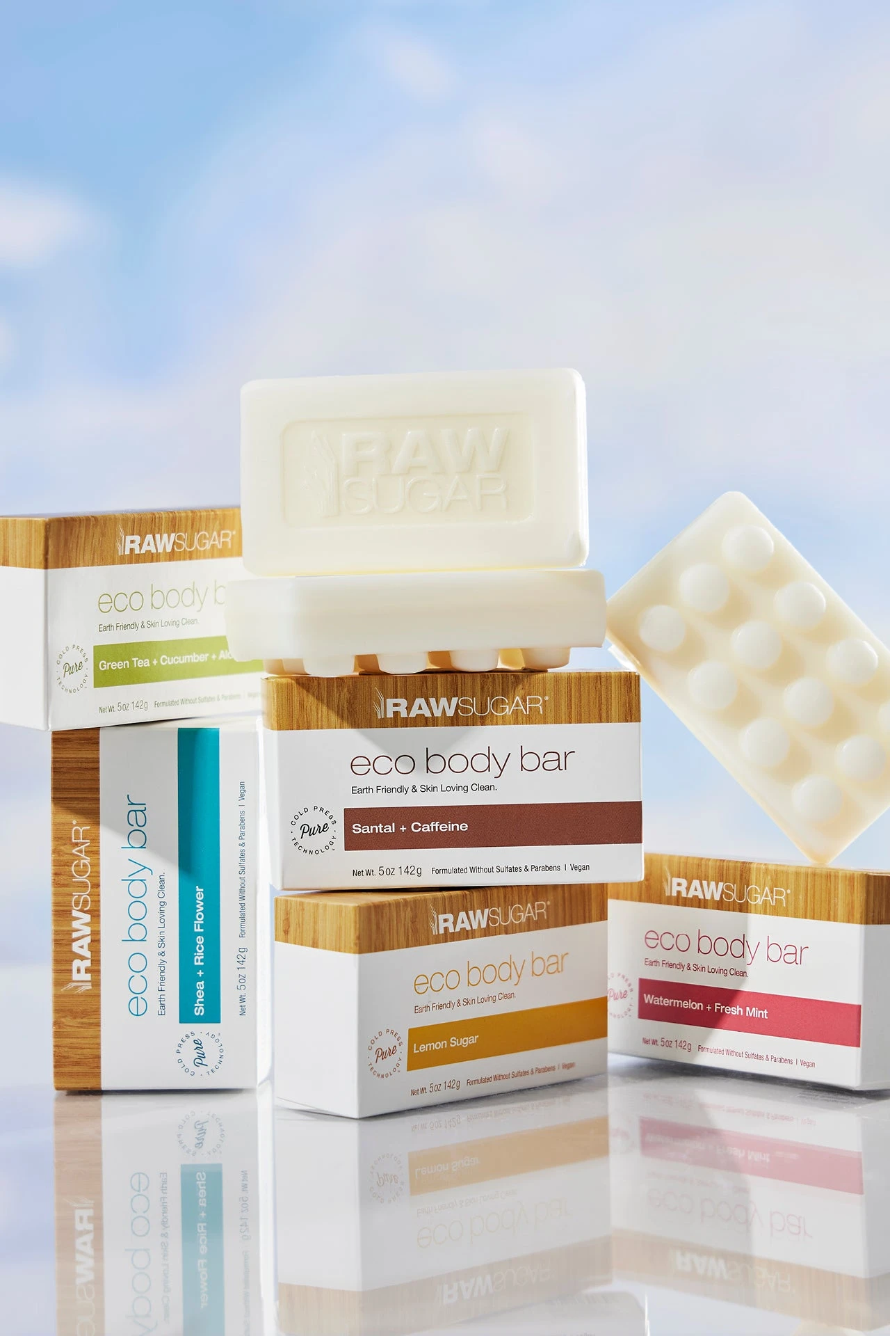 Raw Sugar Eco Bar Soap is Vegan, Cruelty-Free, and formulated without Sulfates and Parabens. Our products are packaged in Post-Consumer Recycled Plastic and made with good-for-you ingredients that won’t harm or strip the skin of its natural goodness. Each Raw Sugar purchase supports the Raw Sugar Initiative- dedicated to making the world a cleaner, healthier, and happier place.
