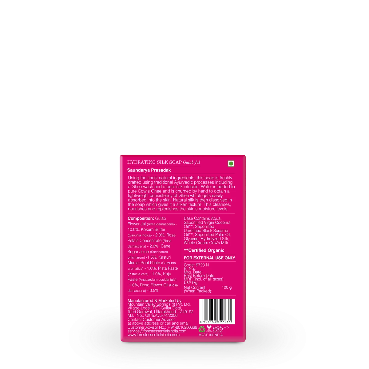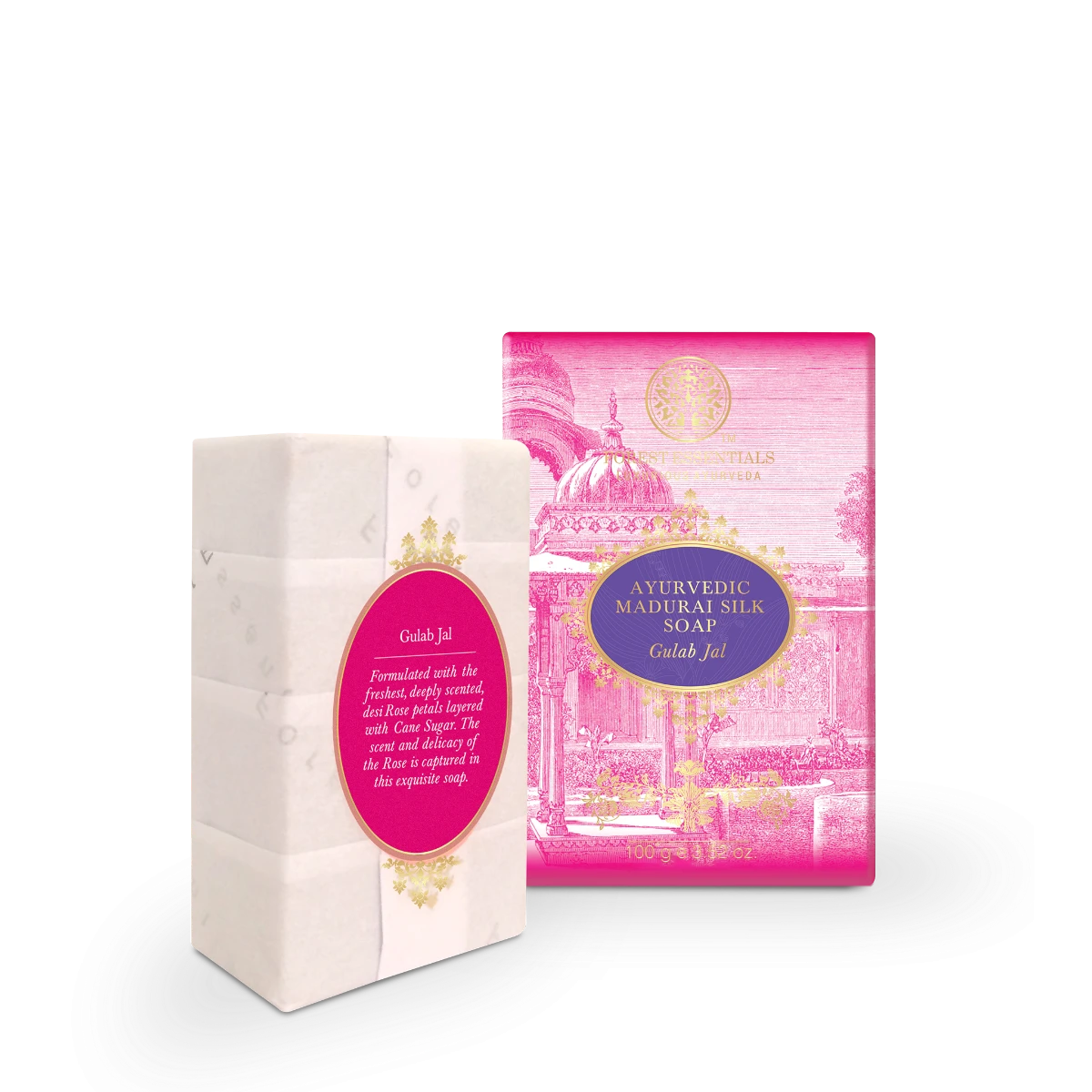 Formulated with the freshest, deeply scented Desi Rose petals, layered with cane sugar and kept in the sun to cure for over 60 days; the hydrating properties of the rose, its scent and delicacy is captured in the resulting mass. This is mixed with butter, herbs, oils and fresh pastes, infused with silk to create the incomparably exquisite Forest Essentials Hydrating Silk Soap Gulab Jal.