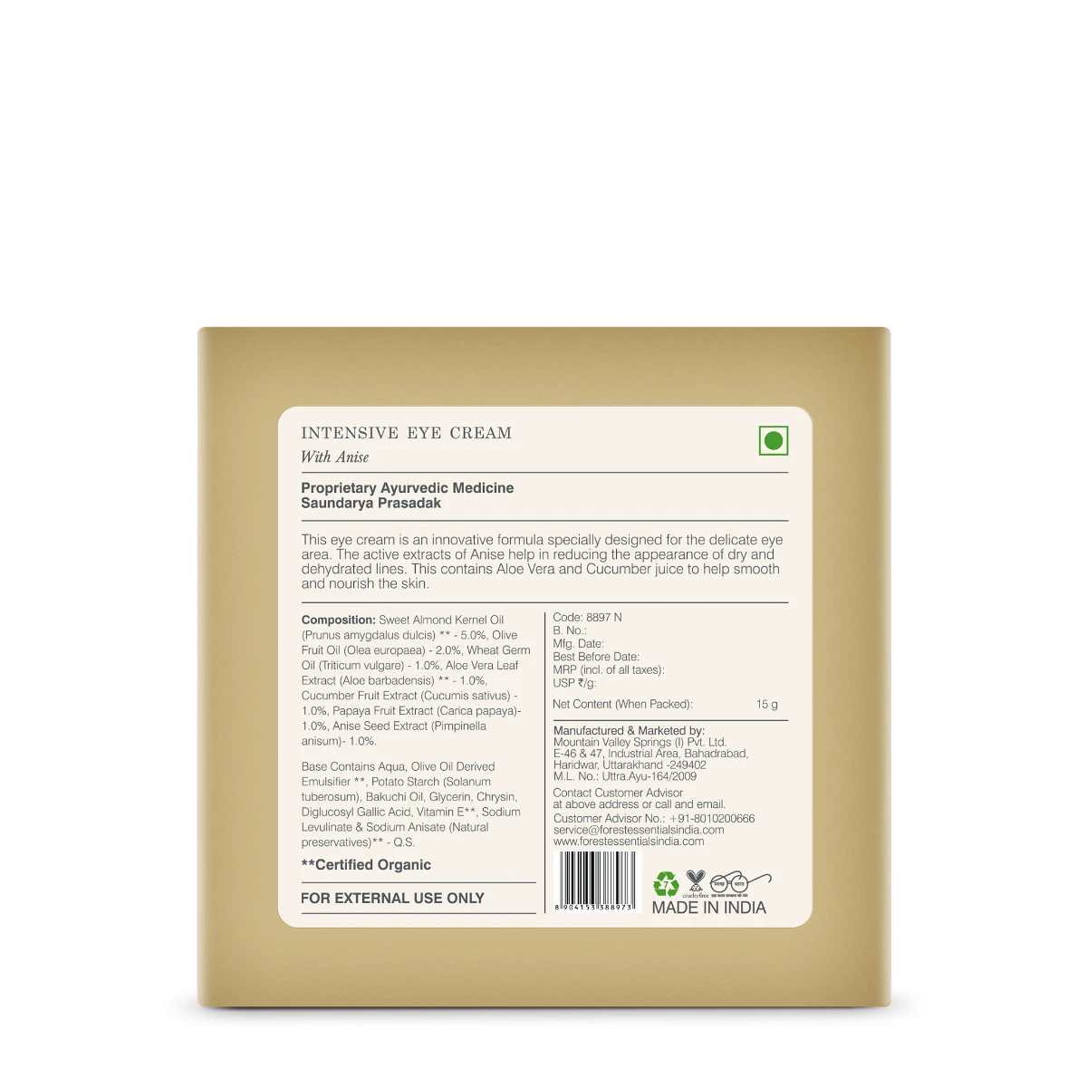 This Forest Essentials Intensive Eye Cream With Anise is an innovative formula specially designed for the delicate eye area. Active extracts of Papaya and Potato starch help in reducing the appearance of dry & dehydrated lines. Anise and Chakshushya help to make the eye area clearer and brighter.