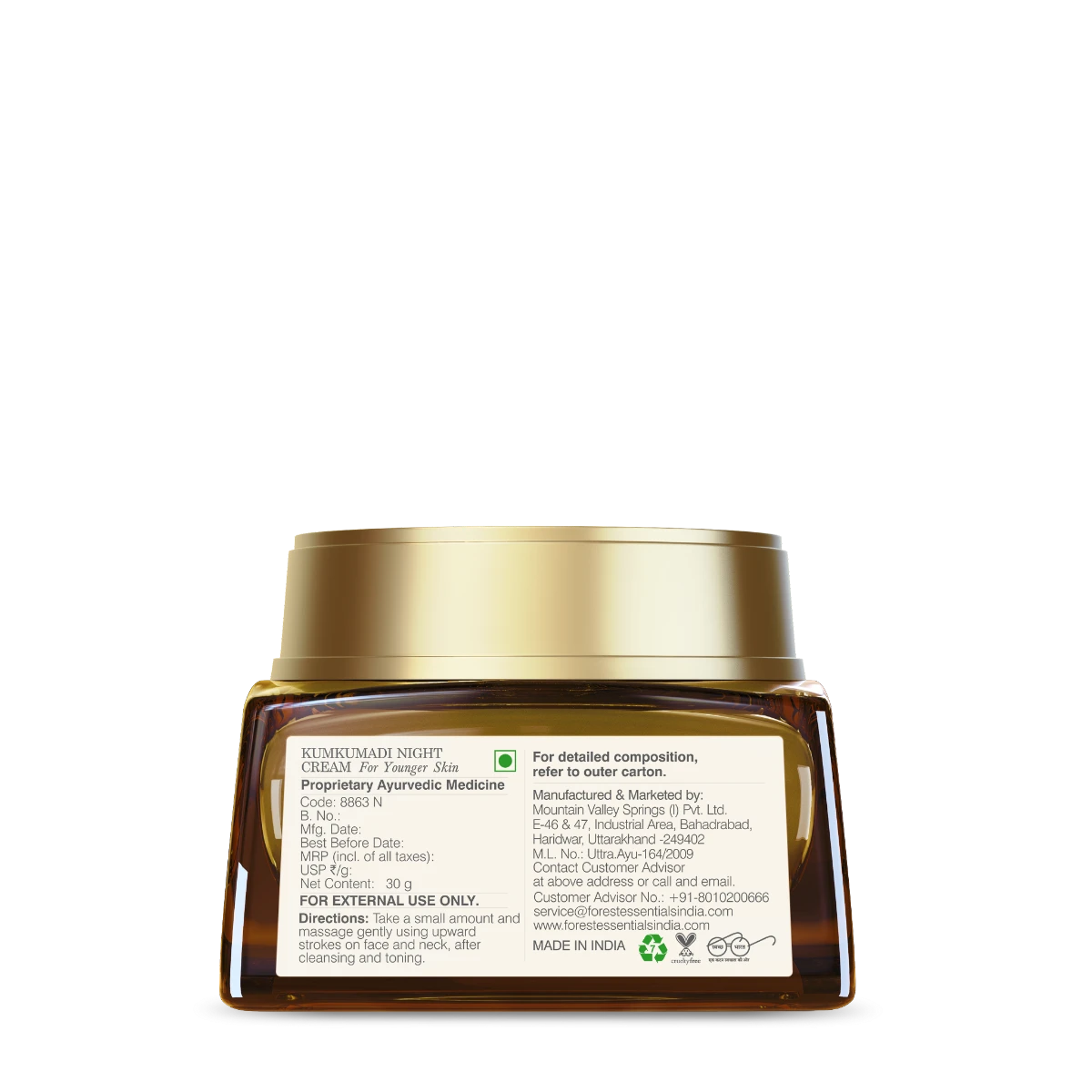Kumkumadi Night cream is specially designed for younger skin. This effective night cream contains powerful Ayurvedic ingredients including Manikya (Ruby) Bhasma, which helps to lighten pigmentation, clarify the skin and heal acne scars.
