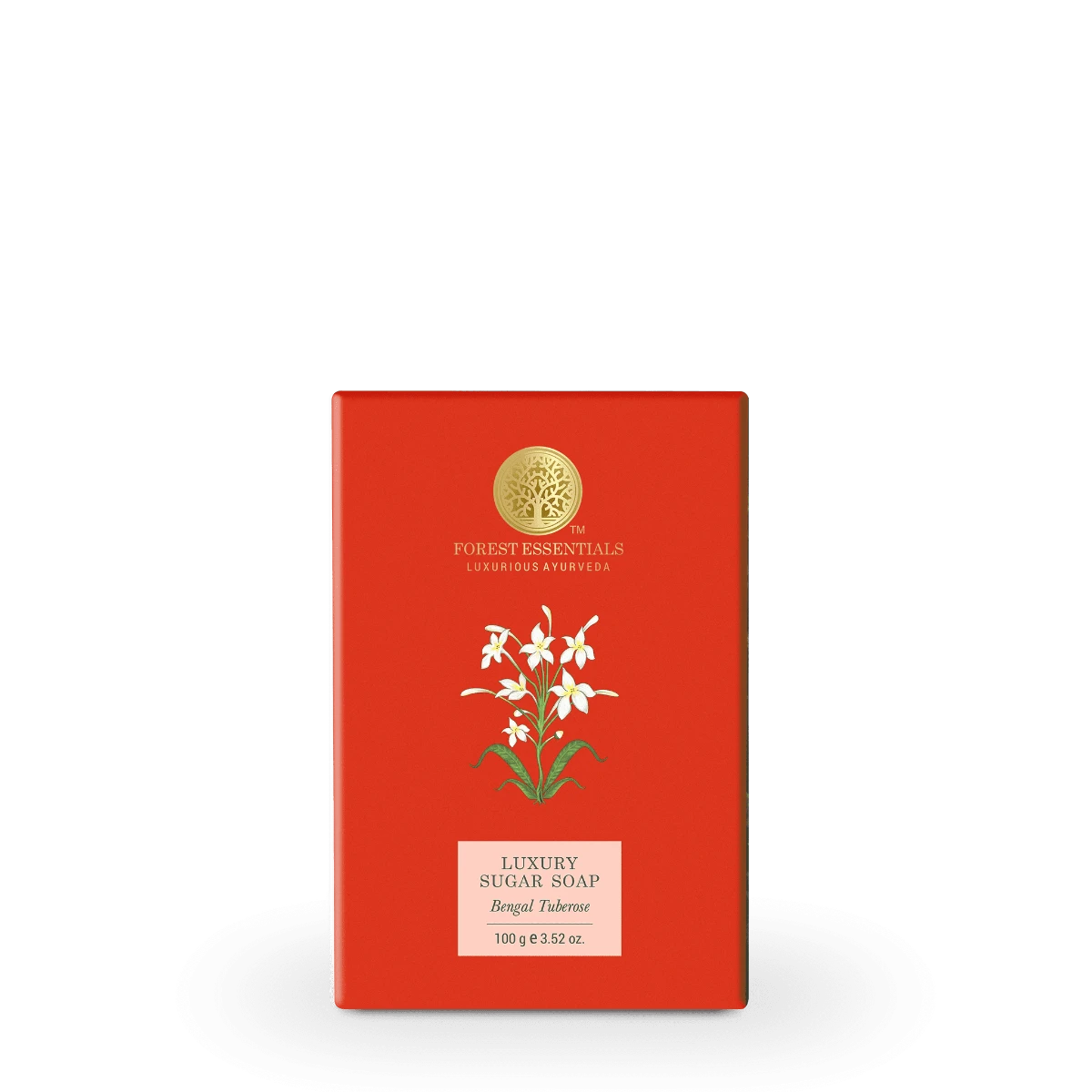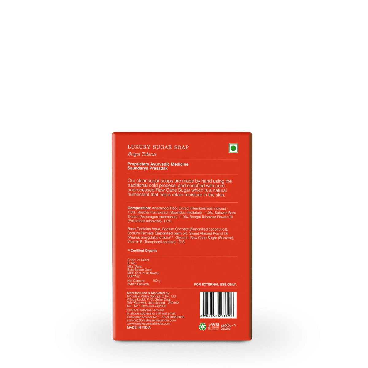 This Forest Essentials Luxury Sugar Soap Bengal Tuberose is a clear soap formulated with organic Cane Sugar, which cleanses the skin without stripping of its natural oils. This Ayurvedic sulphate free soap is infused with the pure essential oil of Tuberose, sourced from Bengal, to lightly scent the skin.