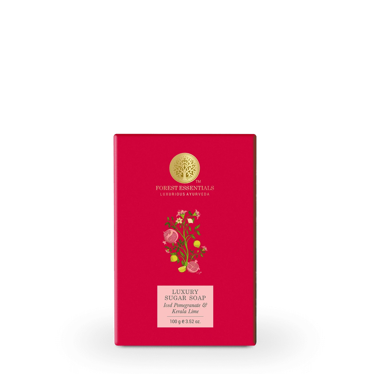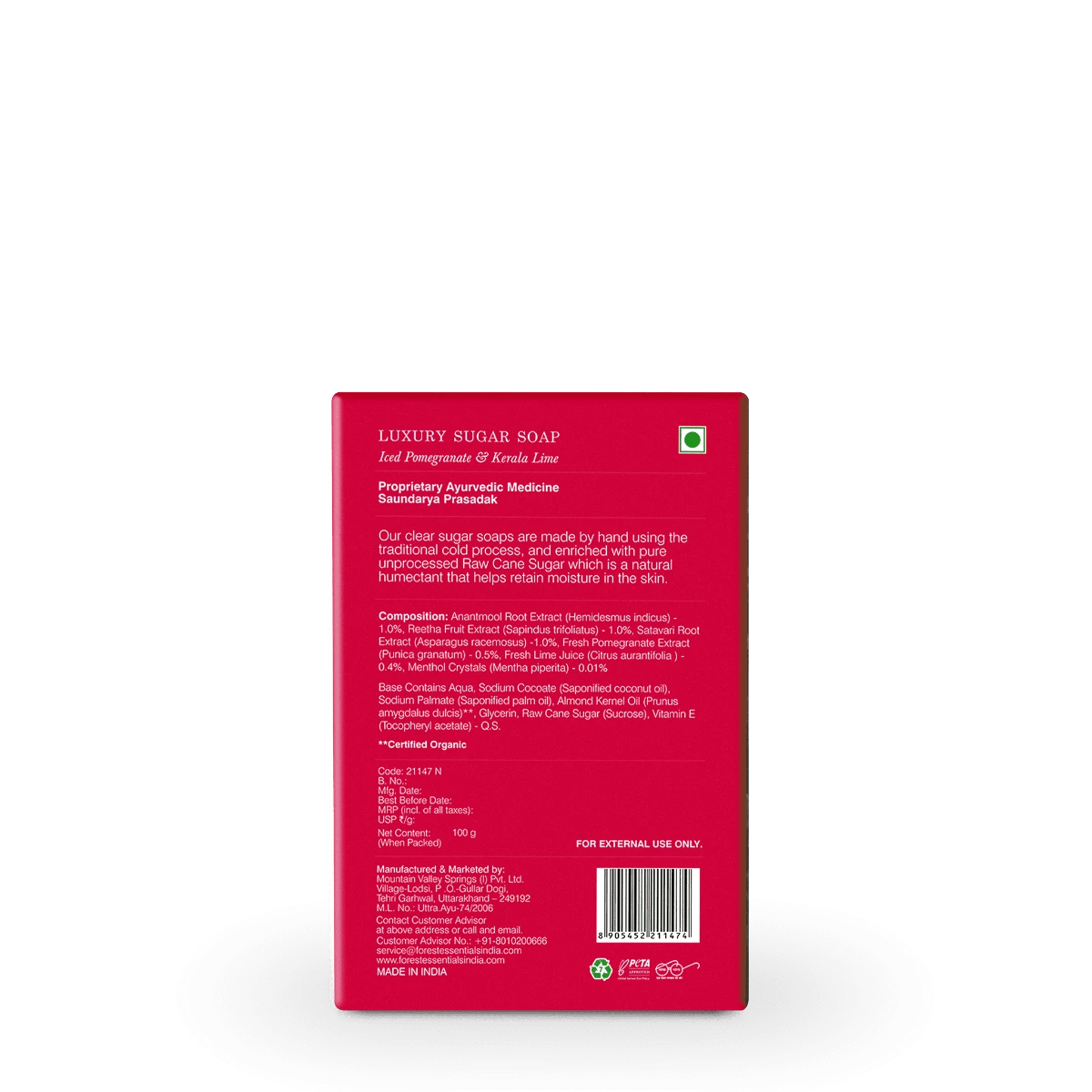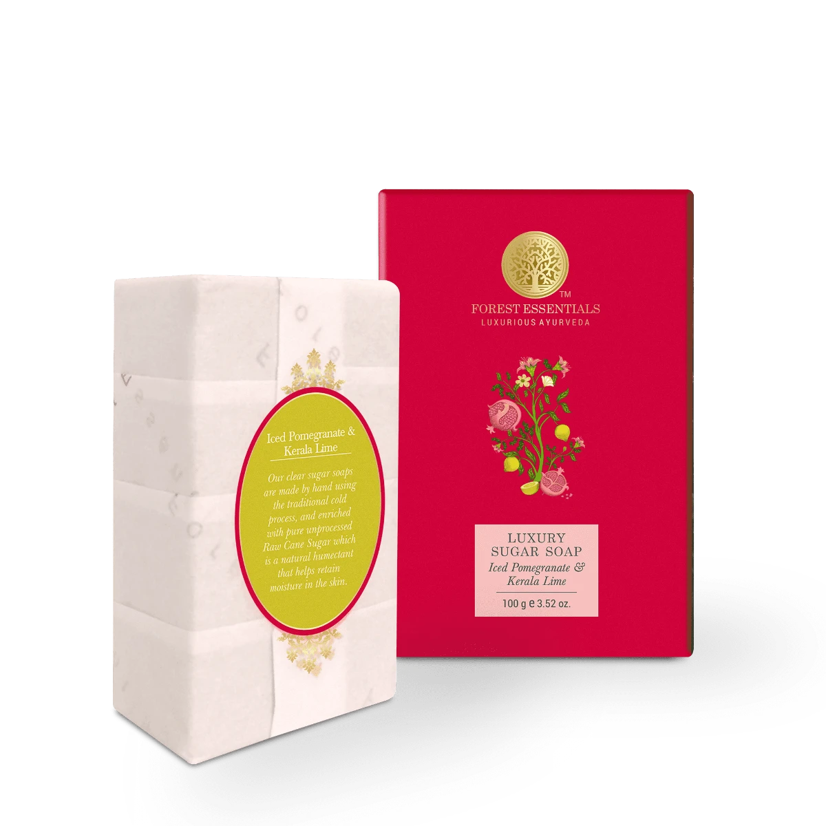 The Forest Essentials Luxury Sugar Soap Iced Pomegranate & Kerala Lime is made by hand using the old fashioned cold process. It is infused with pure unprocessed Raw Cane Sugar, which is a natural humectant that helps retain moisture and cool the skin. The anti-oxidant rich Pomegranate is blended with Fresh Lime to instantly refresh and energize the skin.