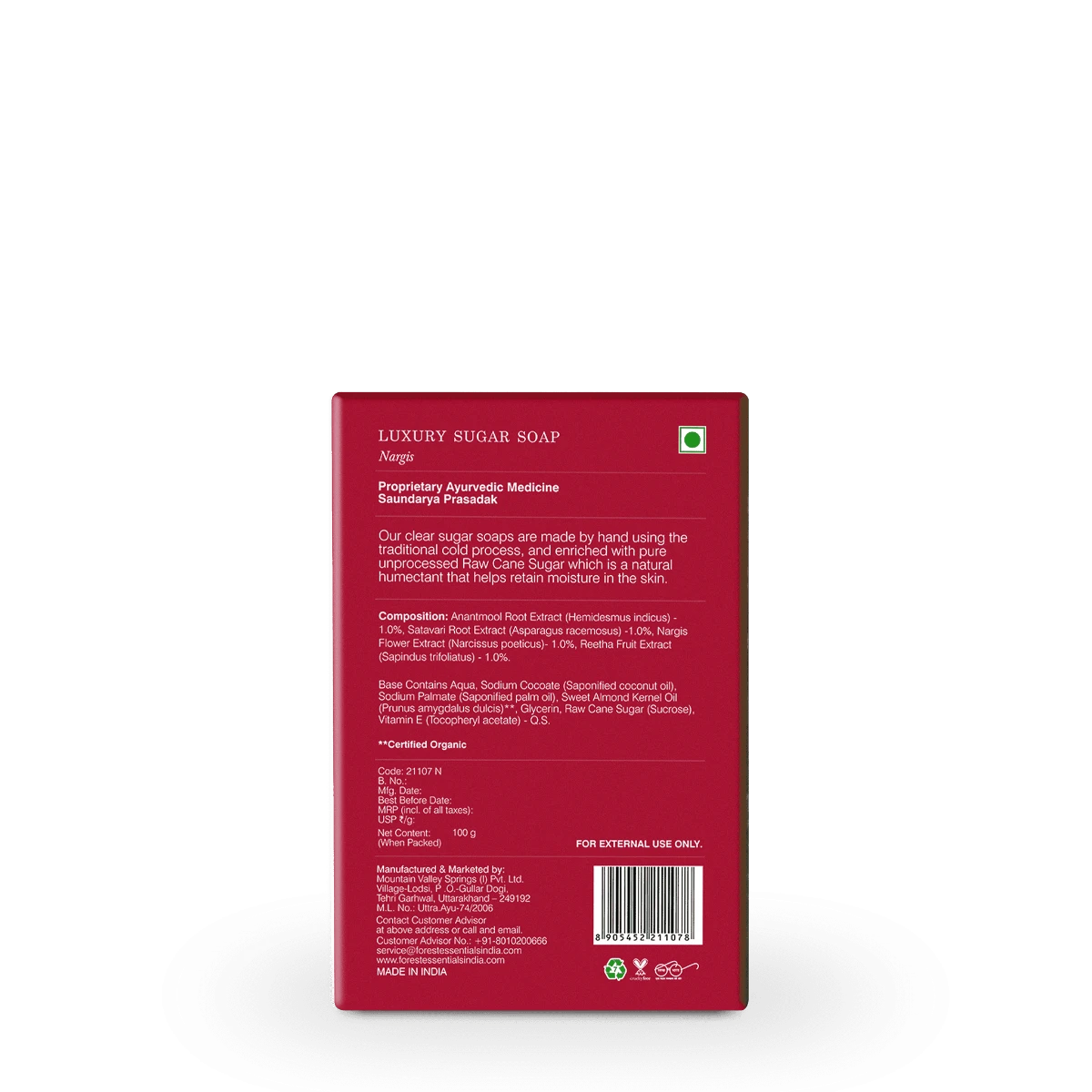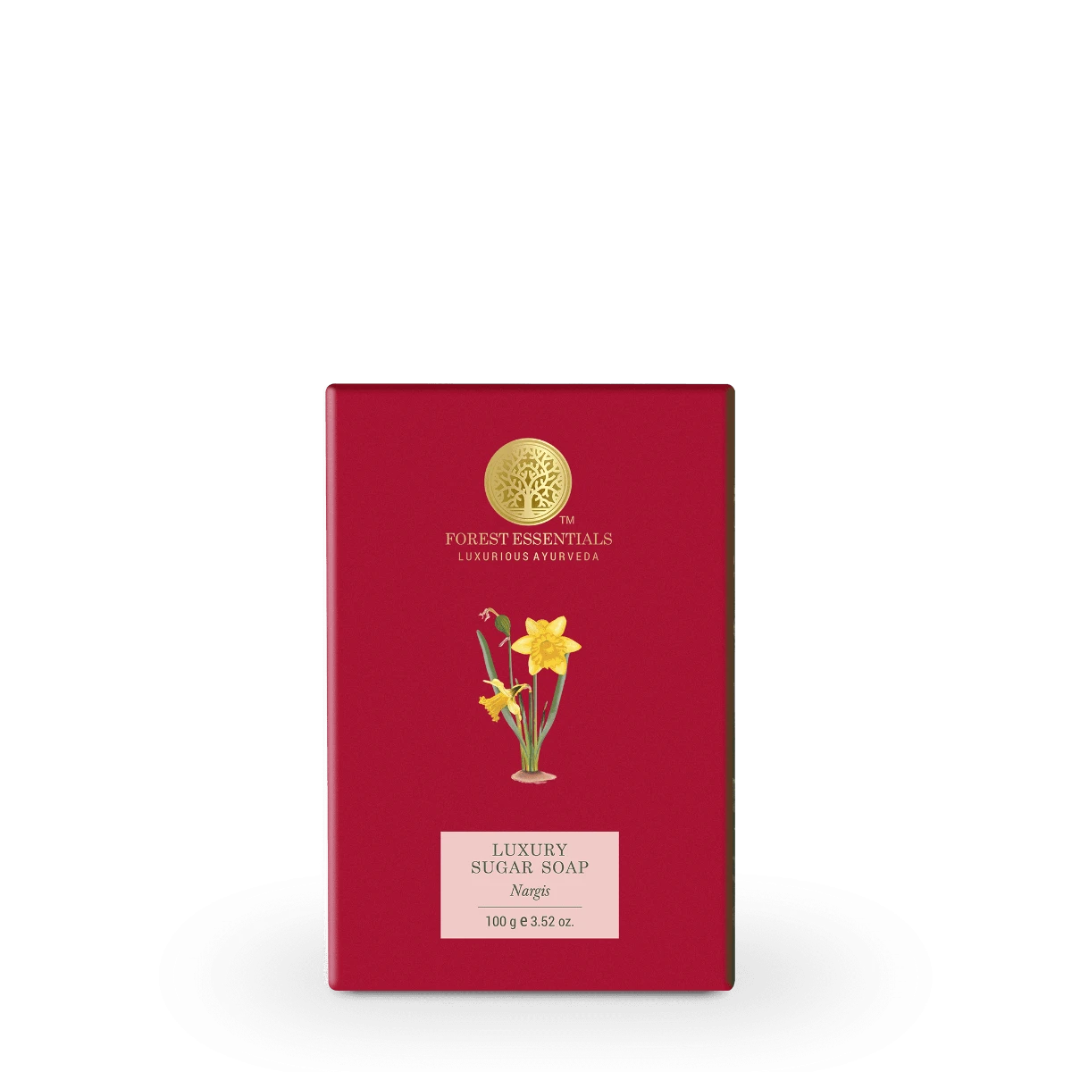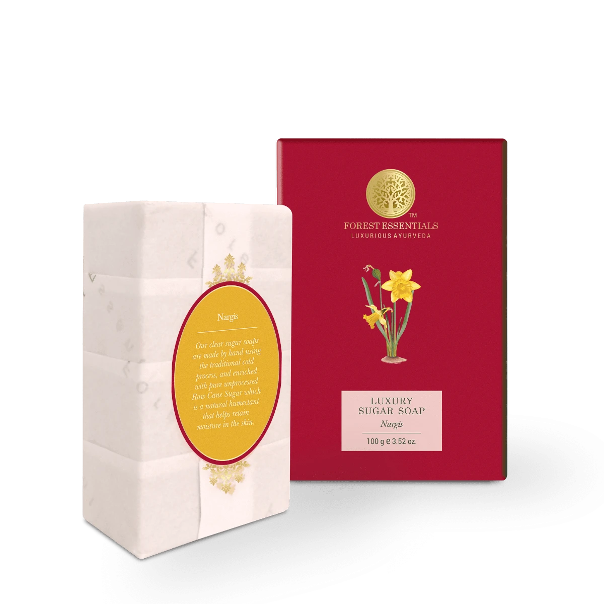 This Forest Essentials Luxury Sugar Soap Nargis is a clear soap formulated with organic Cane Sugar, which cleanses the skin without stripping of its natural oils. This Ayurvedic sulphate free soap is infused with the pure essential oil of Nargis to lightly scent the skin.