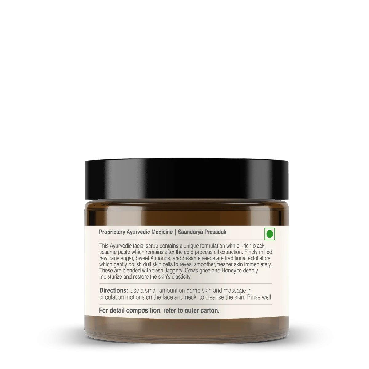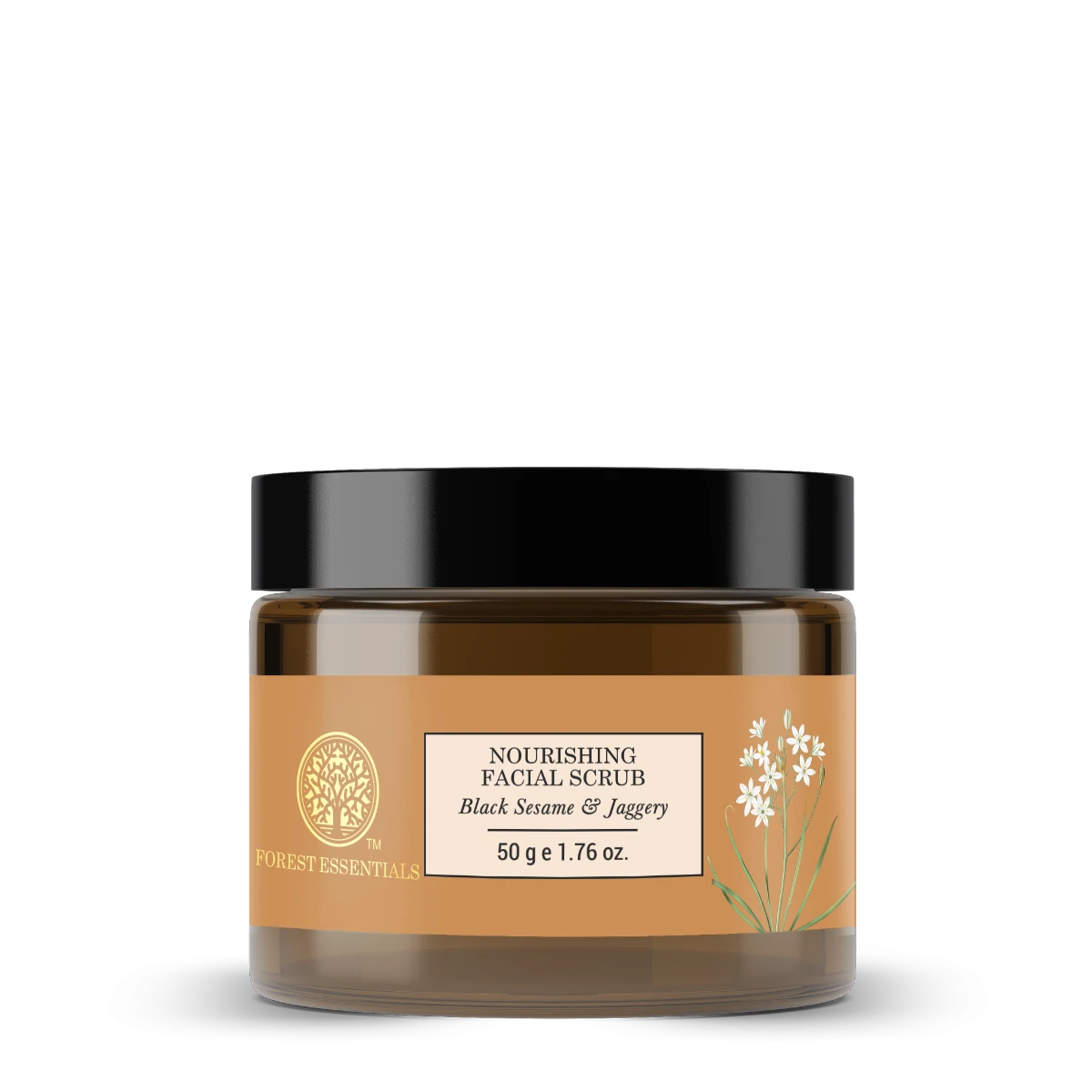 The Forest Essentials Nourishing Facial Scrub is enriched with traditional exfoliators like oil-rich Black Sesame paste, finely-milled Raw Cane Sugar, Sweet Almonds, and Sesame Seeds that are blended with fresh Jaggery, Cow’s Ghee, and Honey to gently polish dull skin cells, deeply moisturize and restore the skin’s elasticity revealing smoother, fresher skin immediately.