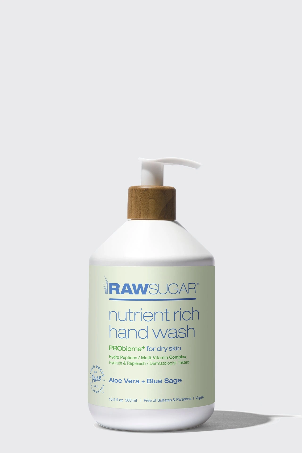 An ultra-gentle formula specifically designed for over-washed and stressed-out hands. This hydrating, benefit driven hand wash makes taking better care of your hands easy. The micro-biome protecting formula is infused with active ingredients like Hyaluronic Acid, Hydro-Peptides, Ceramides and Vitamins to help replenish, hydrate, and feed your hands with the nutrients they need to stay soft and smooth. Â The soothing aroma of sage and aloe vera pairs beautifully with chamomile and eucalyptus to take your hands on a clean, fresh scent journey.