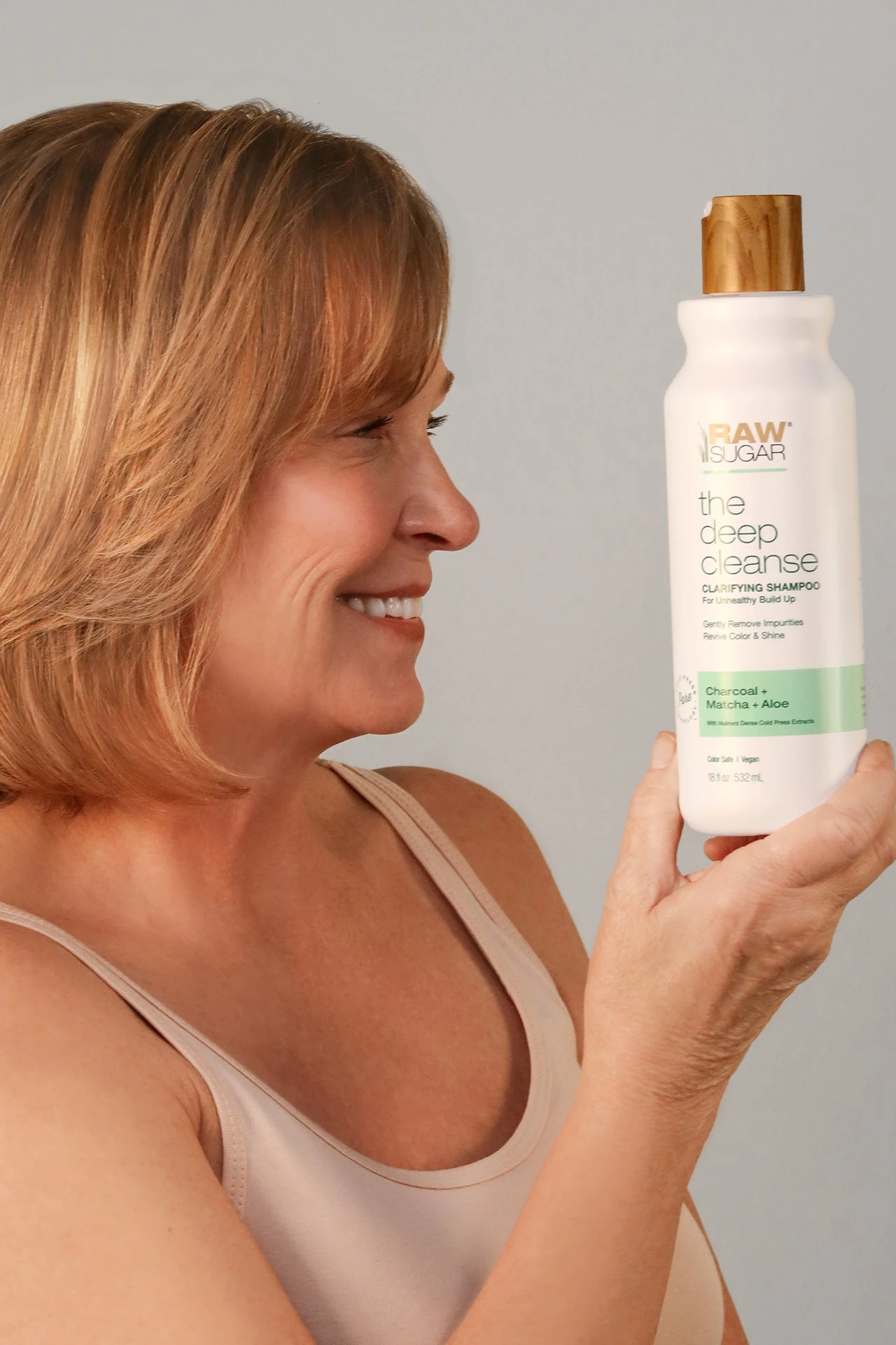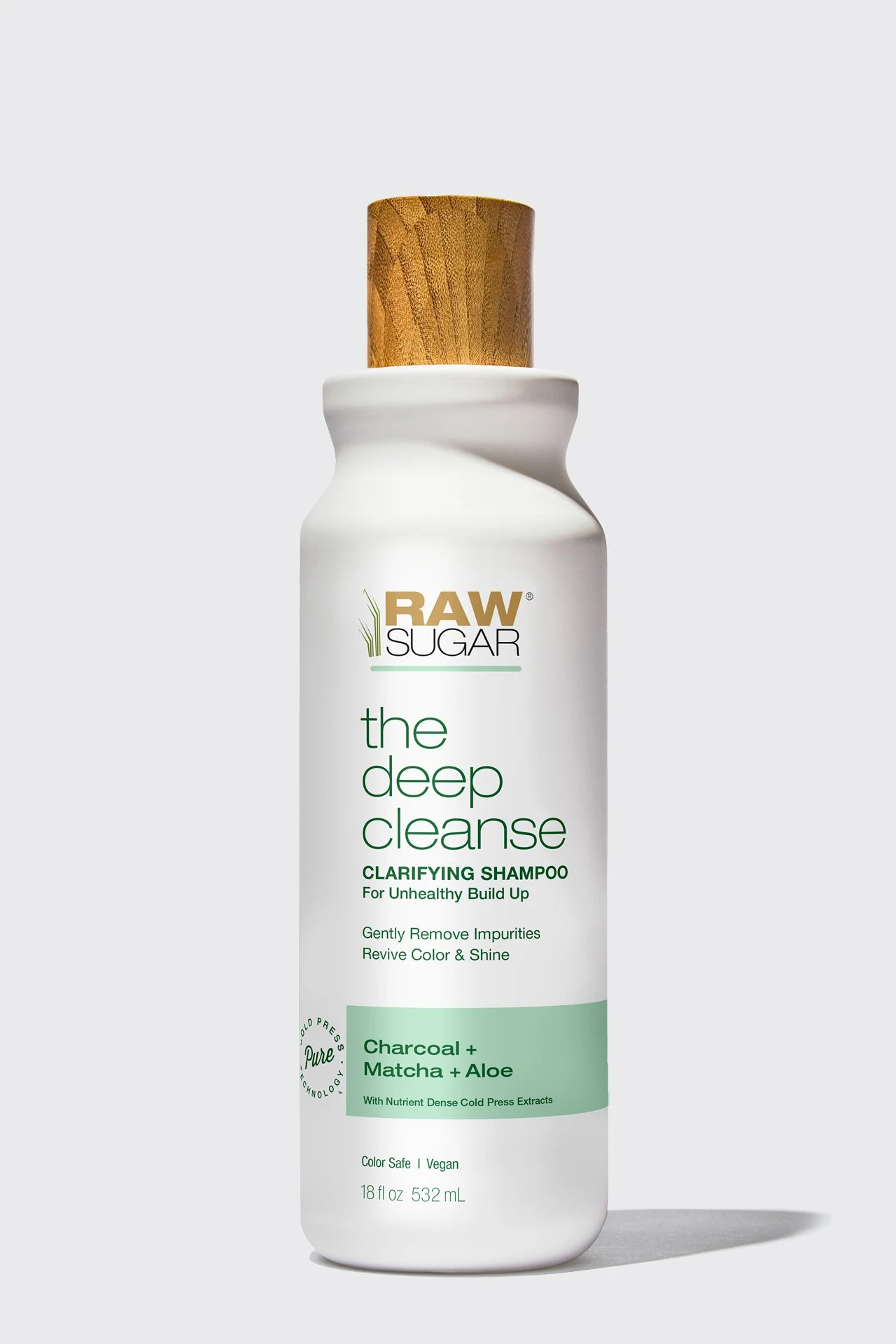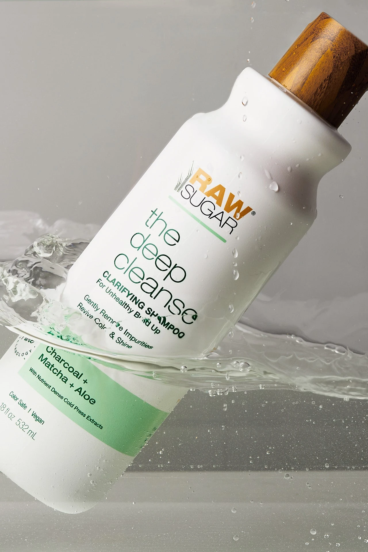 Love your scalp and hair from the outside in with Raw Sugar’s Deep Cleanse Clarifying Shampoo. Crafted with a blend of Charcoal Powder, Matcha Green Tea, and Aloe, our clarifying shampoo is designed to remove unhealthy buildup, restoring hair to a weightless, healthy, natural state. Designed for weekly use, our gentle formula will instantly remove product build-up, purifying and refreshing the scalp. Designed for all hair types, each use reveals the shiny, healthy hair we all dream of. Â